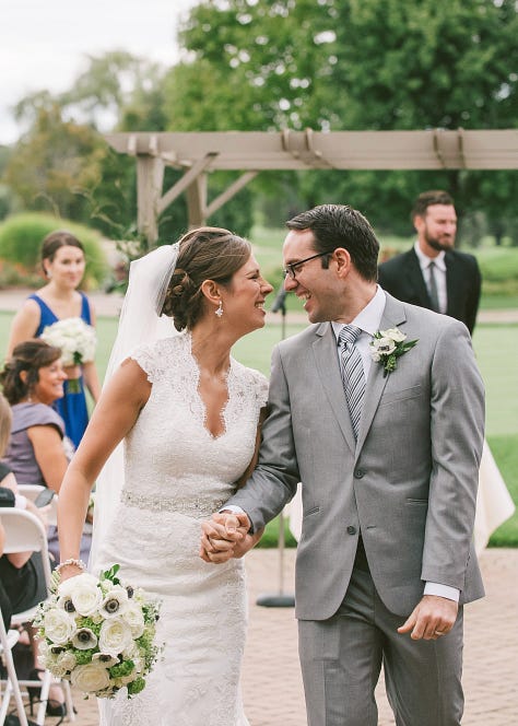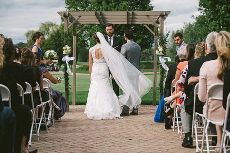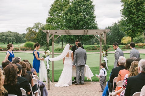 On a rainy turned windy day on September 19, 2015, I stand under a wooden arch pinned with greenery and white ribbon. The sun has just cleared grey clouds, revealing a brilliant blue underneath. The leaves on trees dotting the golf course are still green, they haven’t yet colored red / yellow / orange. My cathedral length-veil, worn also by my mother, threatens to blow right out of the bobby pins securing it to my updo (thank goodness my sister-in-law holds it like a long ponytail during the entire ceremony), and I grin when Nick slides my diamond wedding band on top of my engagement ring.