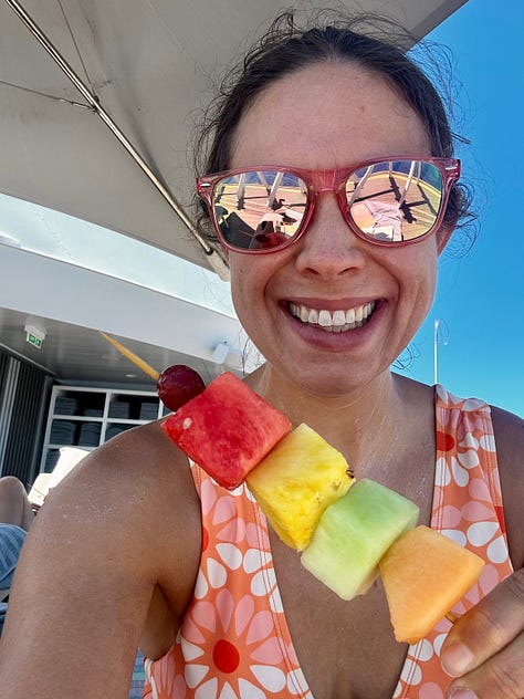 Nick and I spend days at sea relaxing (nothing else I should be doing!). We enjoy the endless oceanview from the gym. I get to ride the Peloton and do strength workouts. We lay by the pool. Thank you, I would in fact like a fruit kabob at 10am and a fruit sorbet at 2pm while I continue reading in my lounger. We nap and sleep hard. My needs and wants are anticipated before I can say a word.