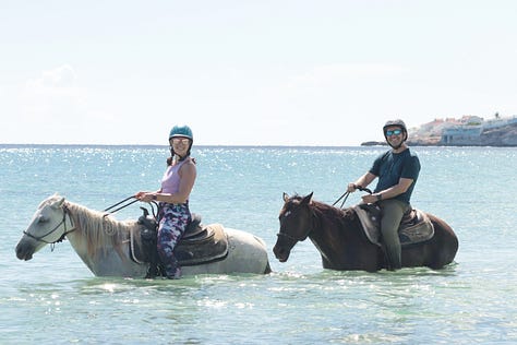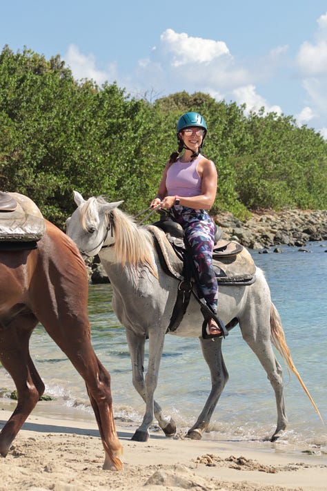 And between days of relaxation? Days of adventure and exploration! We drink fresh coconut juice from a coconut in Saint Maarten and then ride horses into the sea. We swim in the clearest water I’ve ever seen in my life at St. Mageen’s Bay—one of the top ten beaches in the world—on the island of Saint Thomas. We put on goggles and flippers to gaze at rainbow fish, coral, anemones on Pearl Island in the Bahamas.